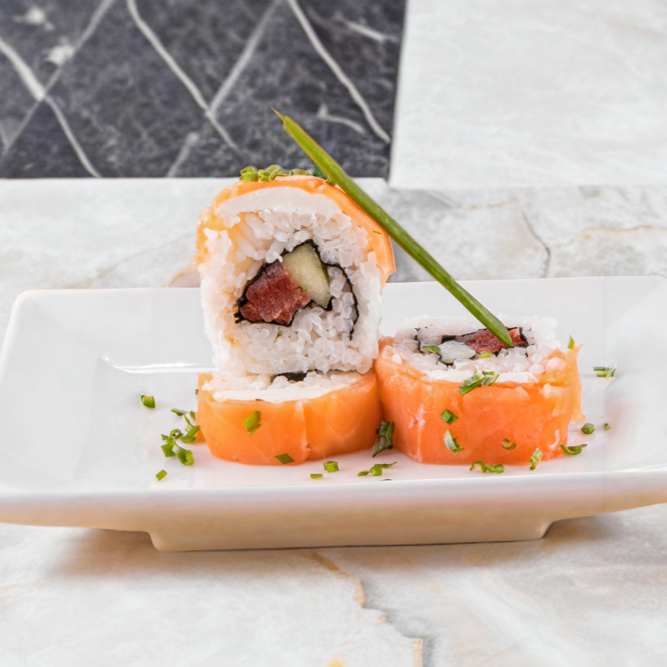 Atún fresco, pepino, zanahoria, queso crema y mango por fuera. Por temporada.