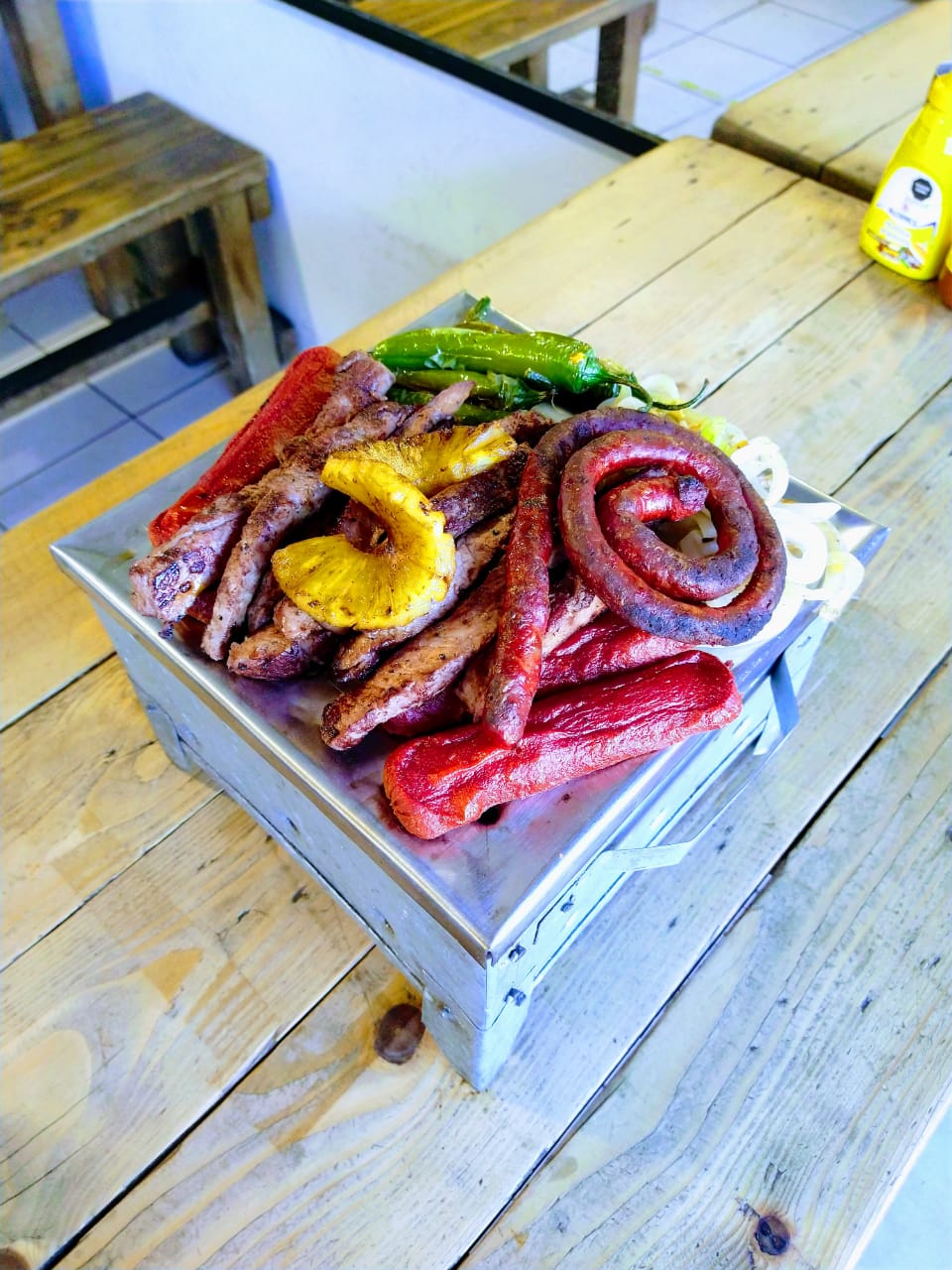 Arrachera, chistorra, salchichón, piña cebolla asada, chiles toreados ,limones y salsa.