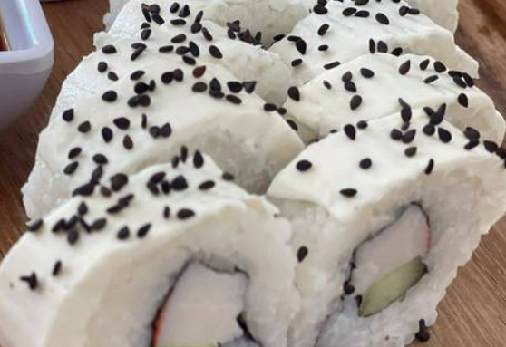 Queso crema por fuera y ajonjolí, surimi y pepino por dentro.