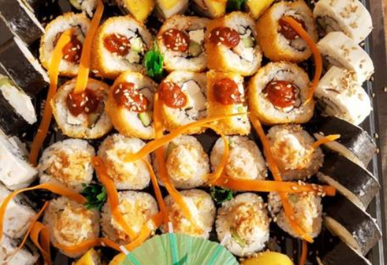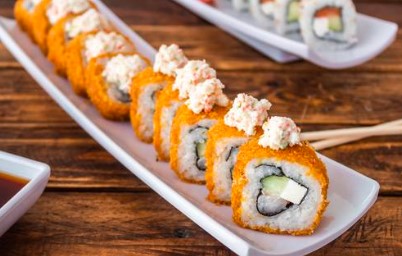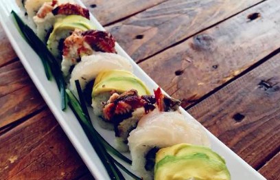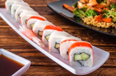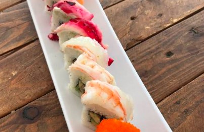 Por dentro pepino en julianas y camarón capeado, por fuera aguacate y pescado blanco