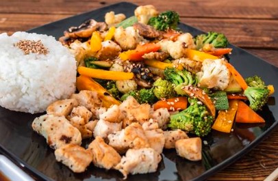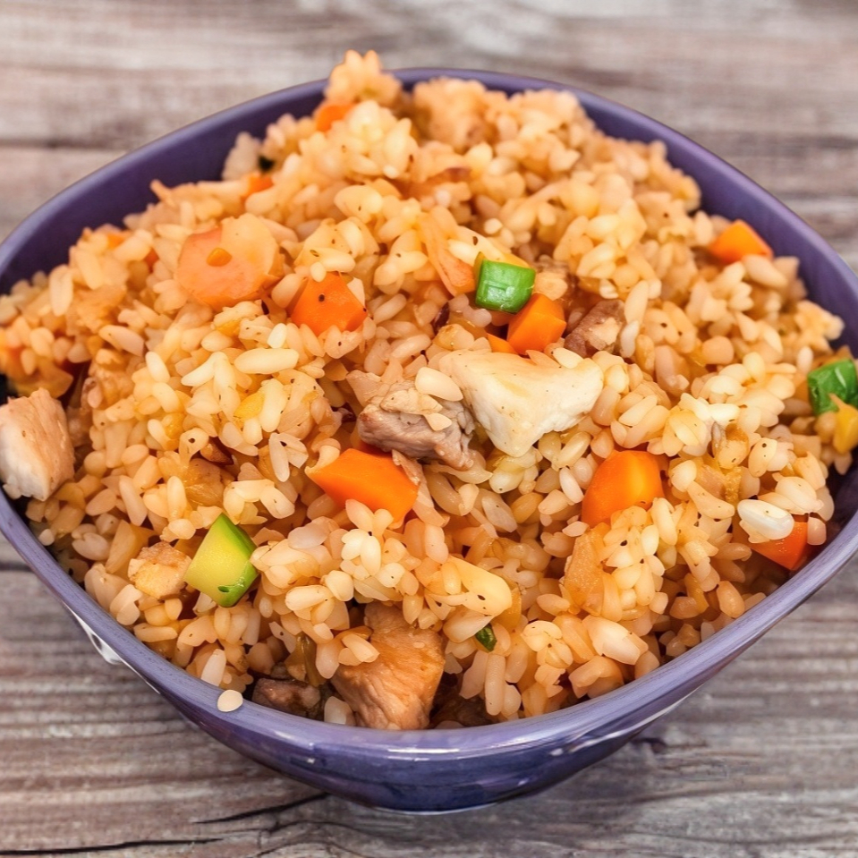 Arroz al vapor, con verdura, arrachera, camarón, pollo, cubos de aguacate y queso crema, morrón, champiñón y cebollín.