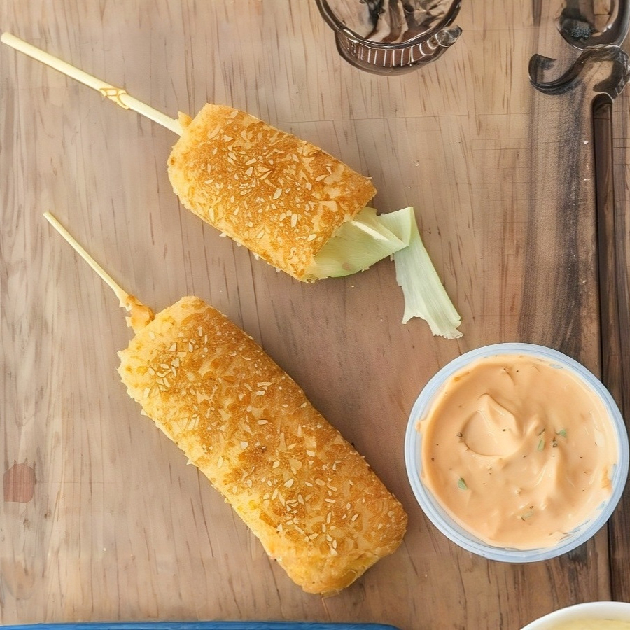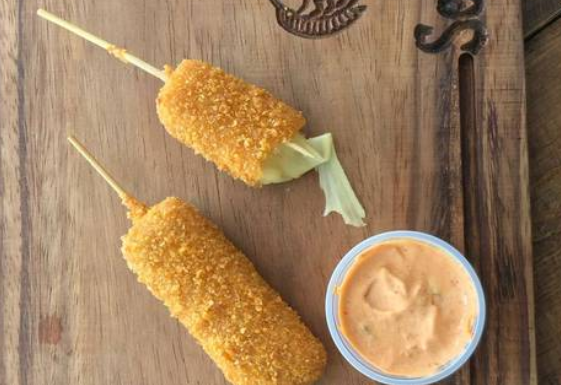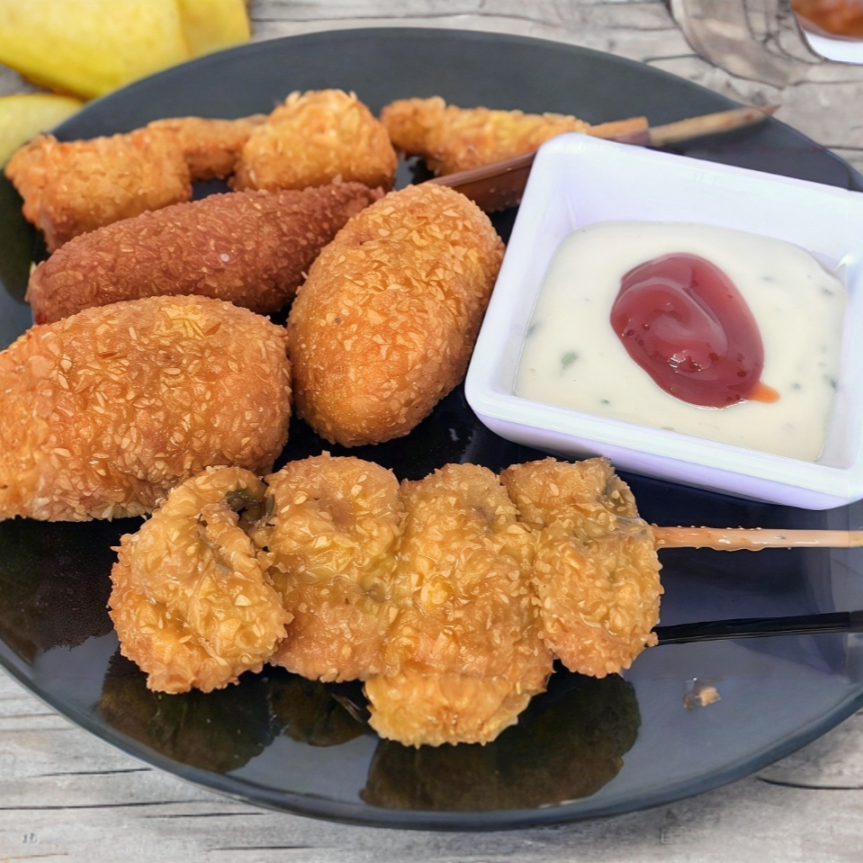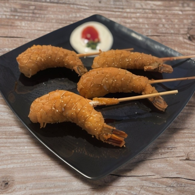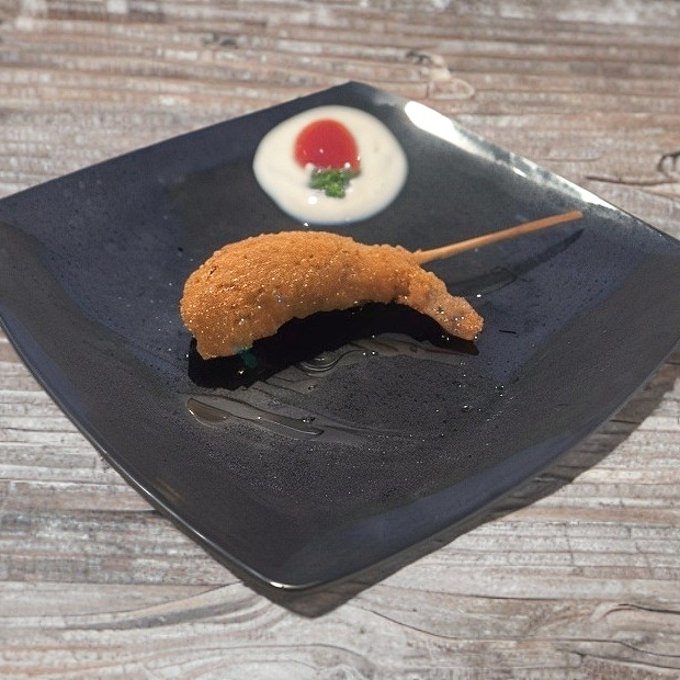1 Brocheta de camarón con queso crema empanizada y frita.