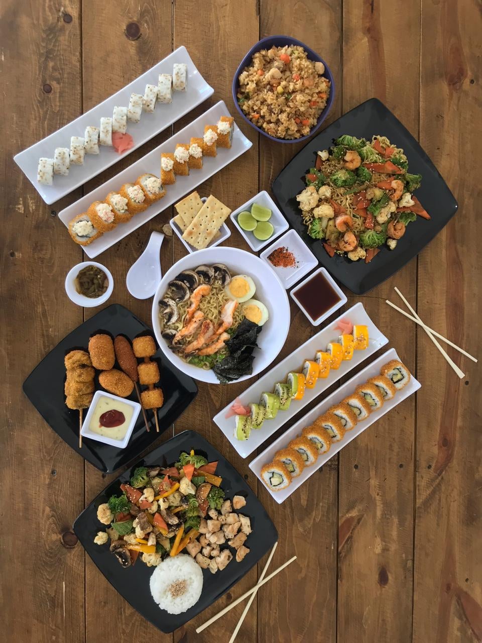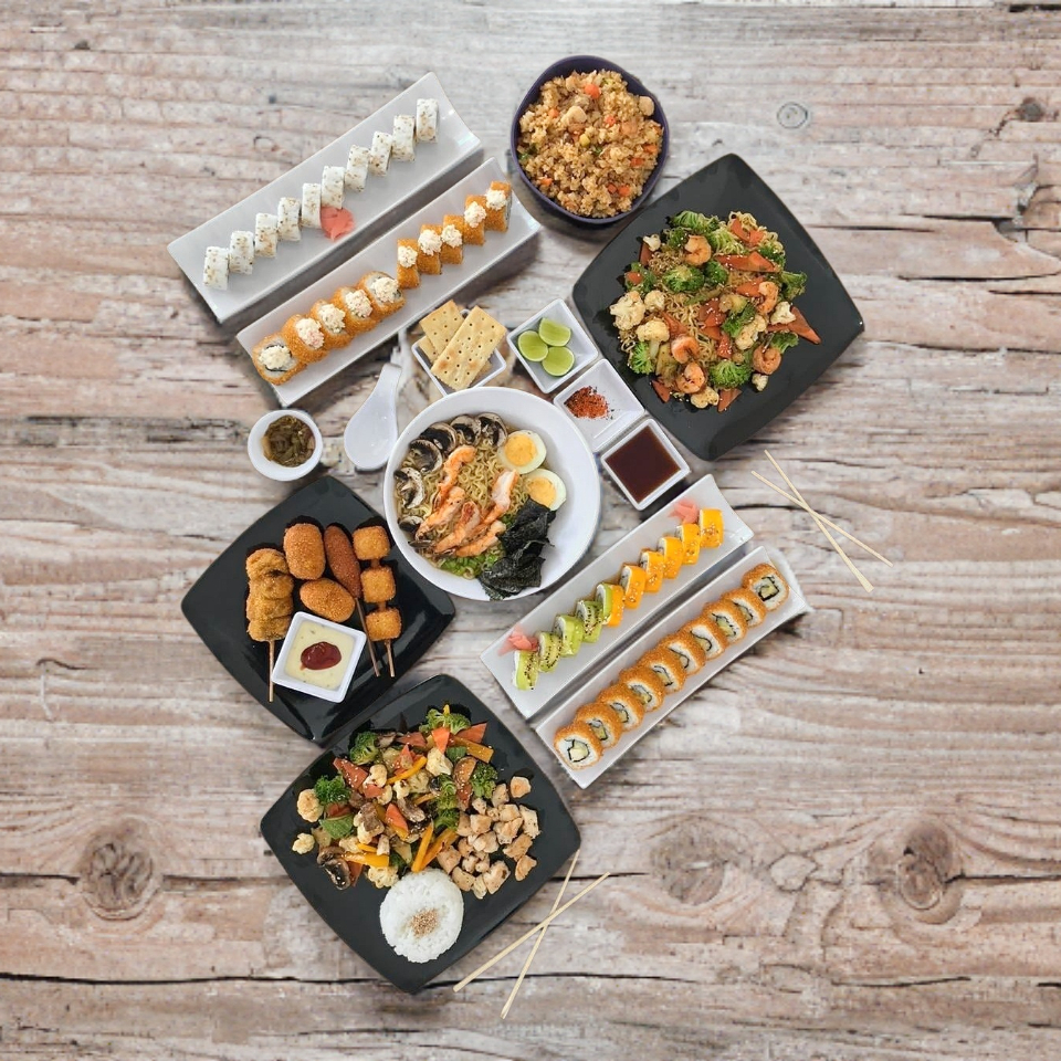 4 Yakimeshi mixtos, 1 orden de brochetas, 4 makis a elegir, 4 gyosas.