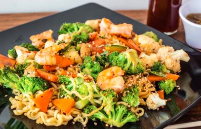 Fideos y variedad de verduras a la plancha sazonadas con un toque de aceite de ajonjolí, Pollo, Arrachera y camarón sazonados con hierbas finas y aceite de oliva.