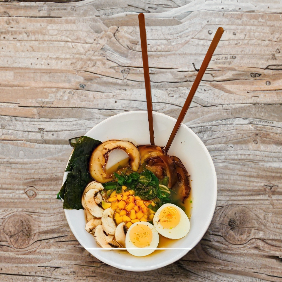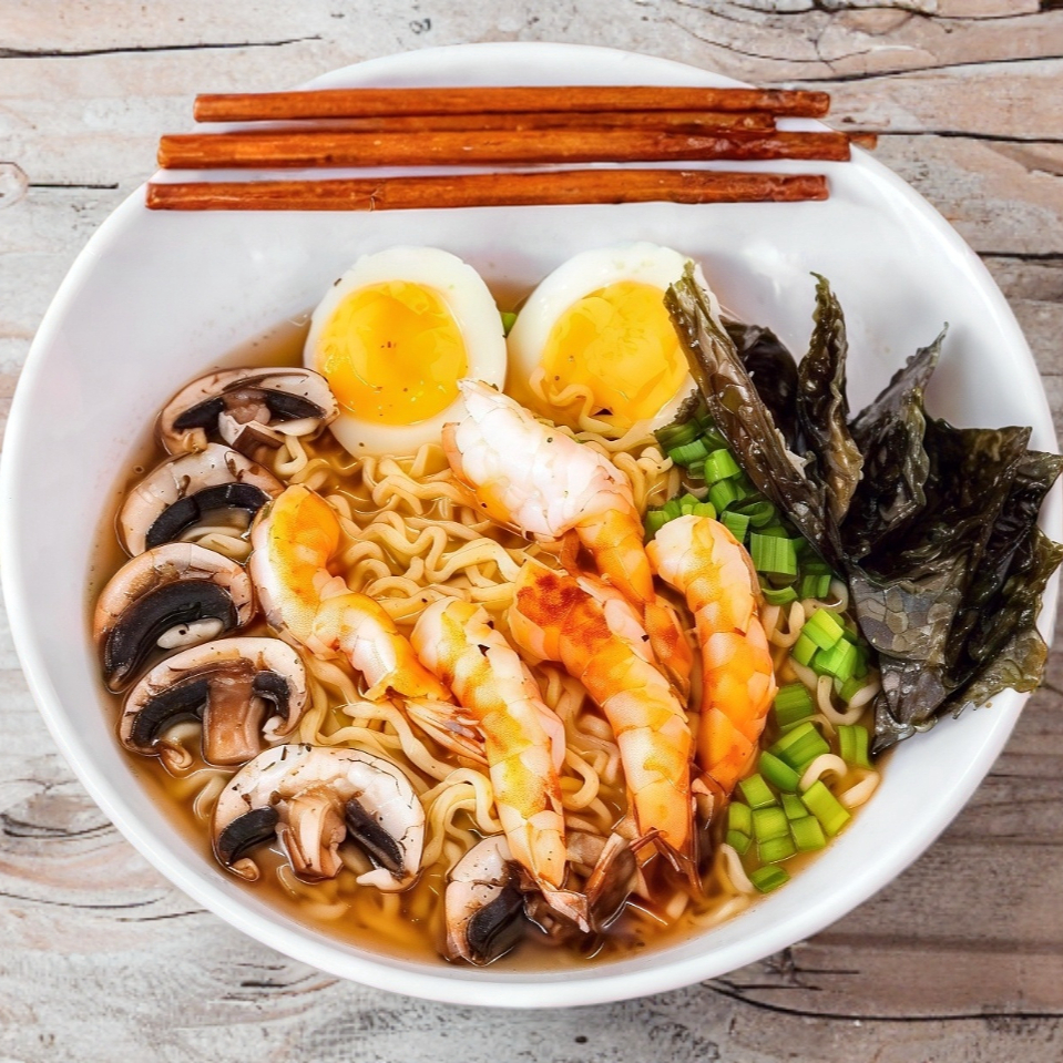 Tallarines, champiñón, cebollín, base miso, huevo cocido y camarón a la plancha sazonado.