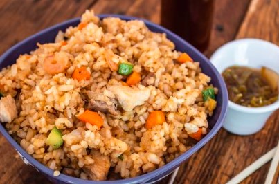 Arroz frito de res, camarón ó pollo, 2 makis a elegir, 1 orden de brochetas mixtas.