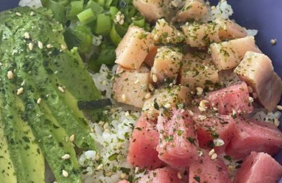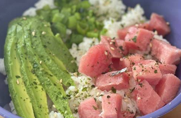 Arroz shari, aguacate, cebollín y furikake y trozos de atún.