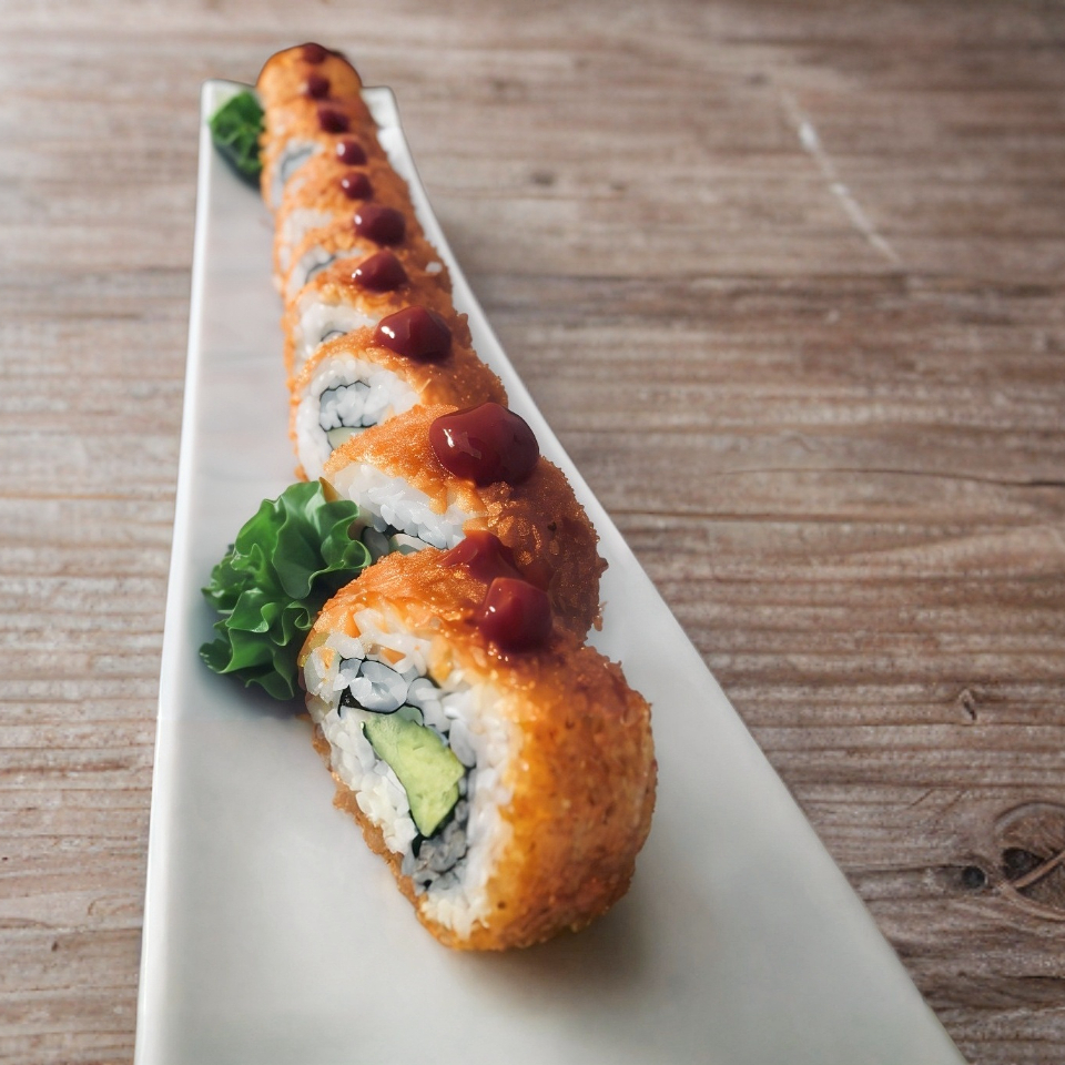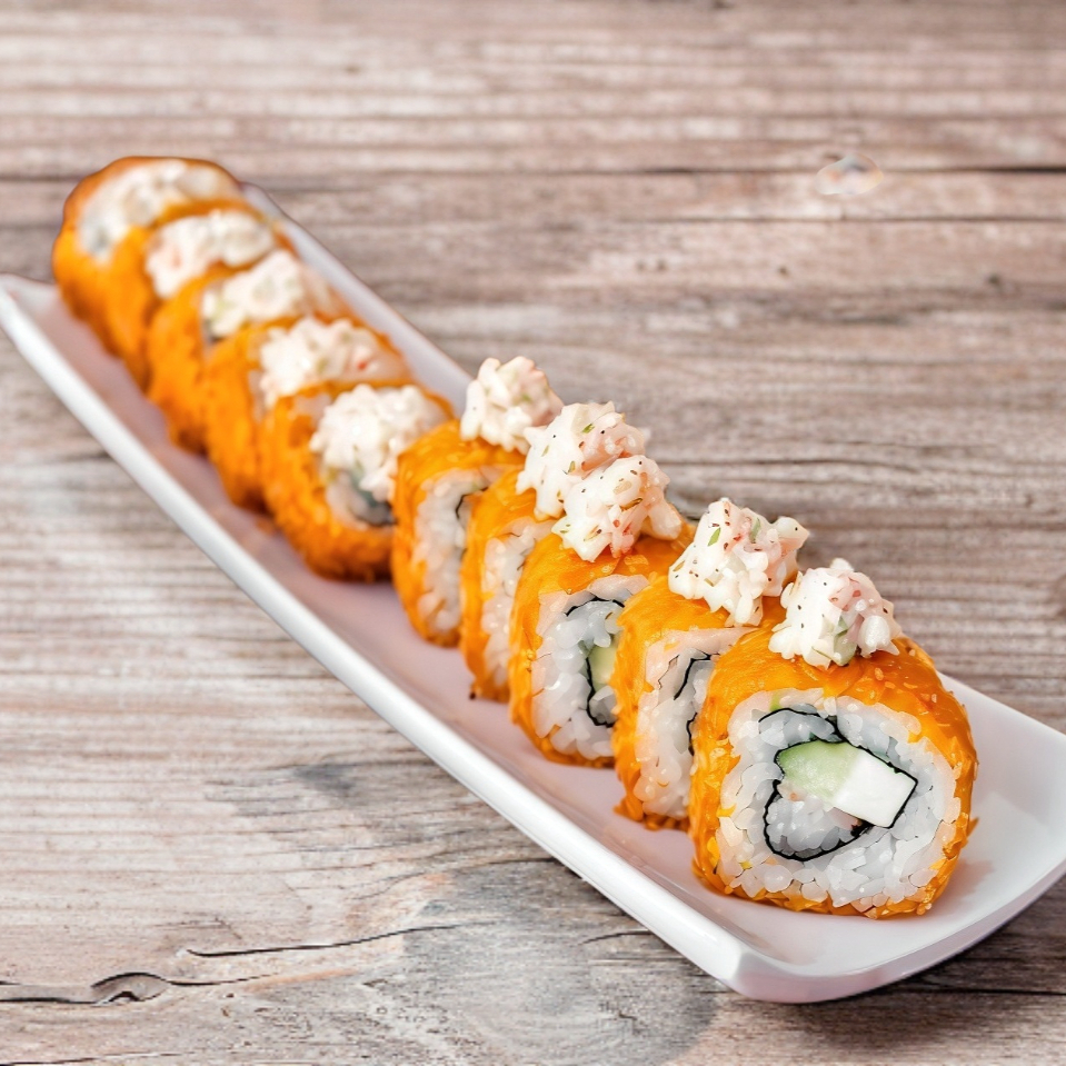 Empanizado con alga por fuera, arroz frito base, pescado empanizado, aguacate y queso crema.