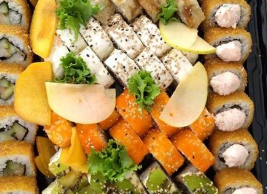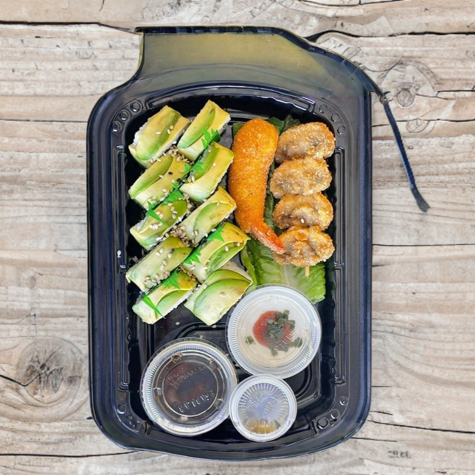 1 L de agua, pepino, calipico 2 arroz frito verdura, 1 yakisoba de verdura, 1 orden de brochetas mixtas, 2 makis a elegir, excepto especialidades.