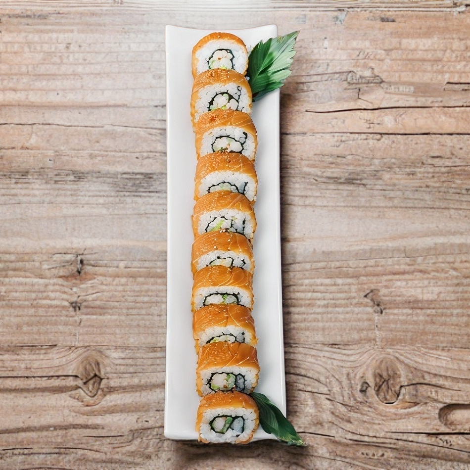 Cubierto con salmón, por dentro camarón, pepino y queso crema.