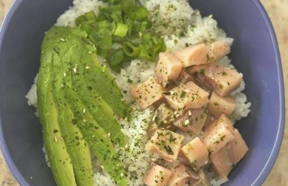 Arroz shari, aguacate, cebollín, furikake y salmón en cubos.