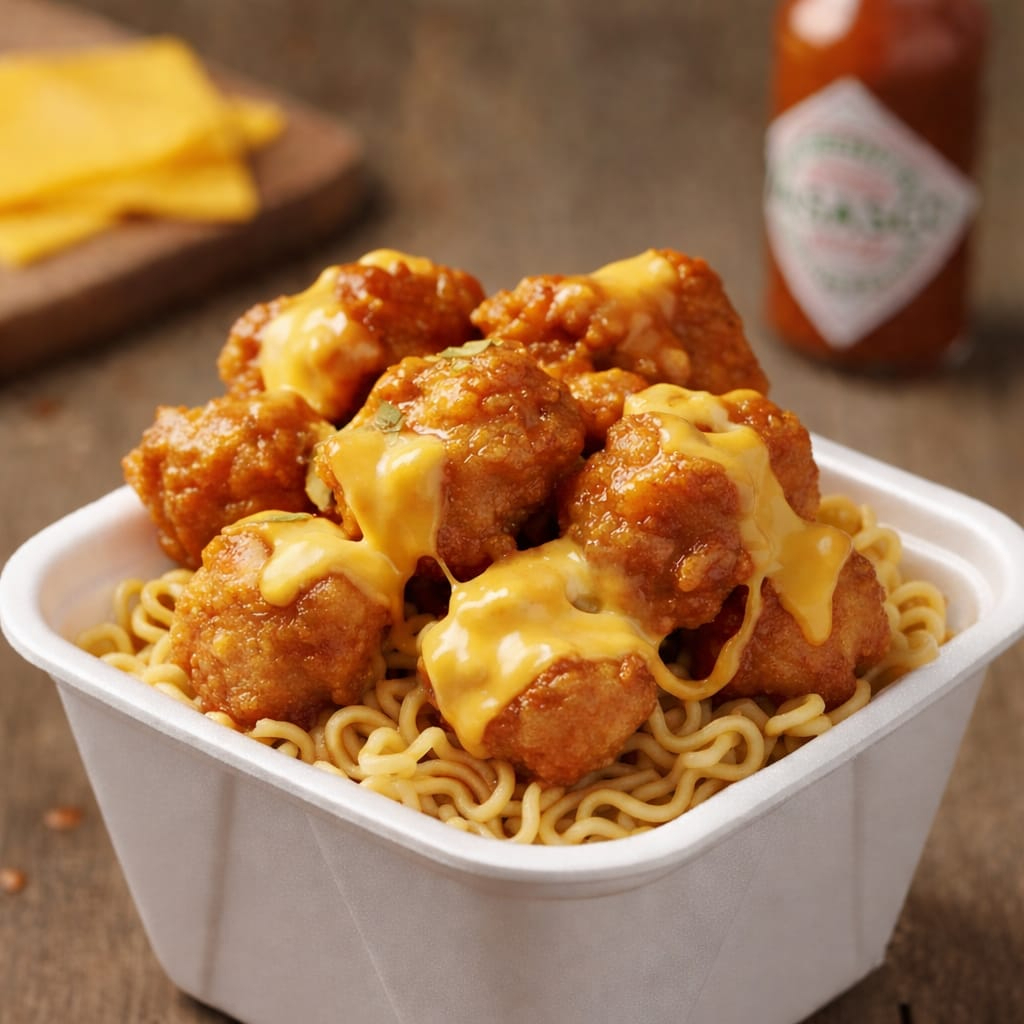 Maruchan preparada con 200 gr boneless, servida con queso amarillo jalapeño. Porción individual. Información alergénica: Los sabores de camarón contienen condimento con mariscos.