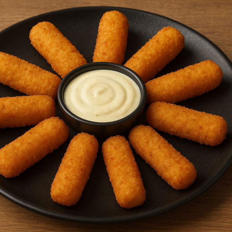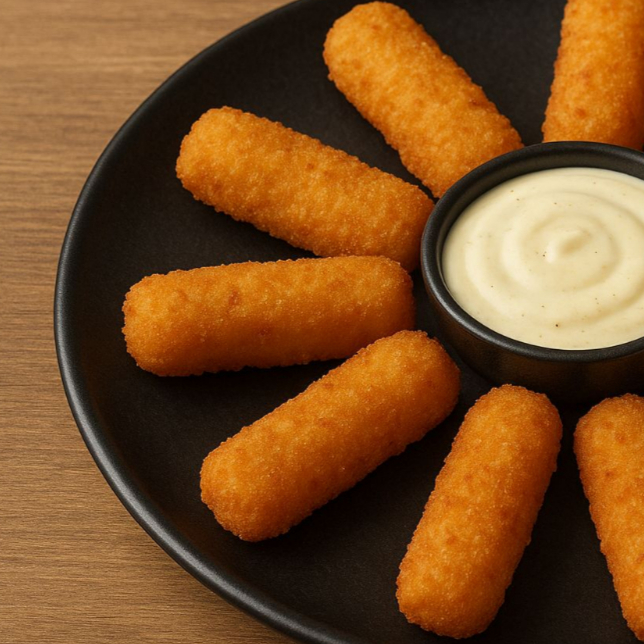 Orden mediana, aprox. 6 pzas de crujientes dedos de queso. No incluye salsas, elige tus salsas extra para acompañar.