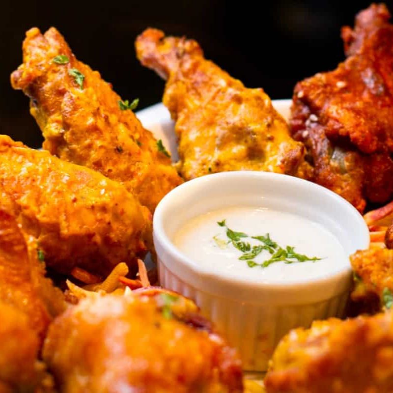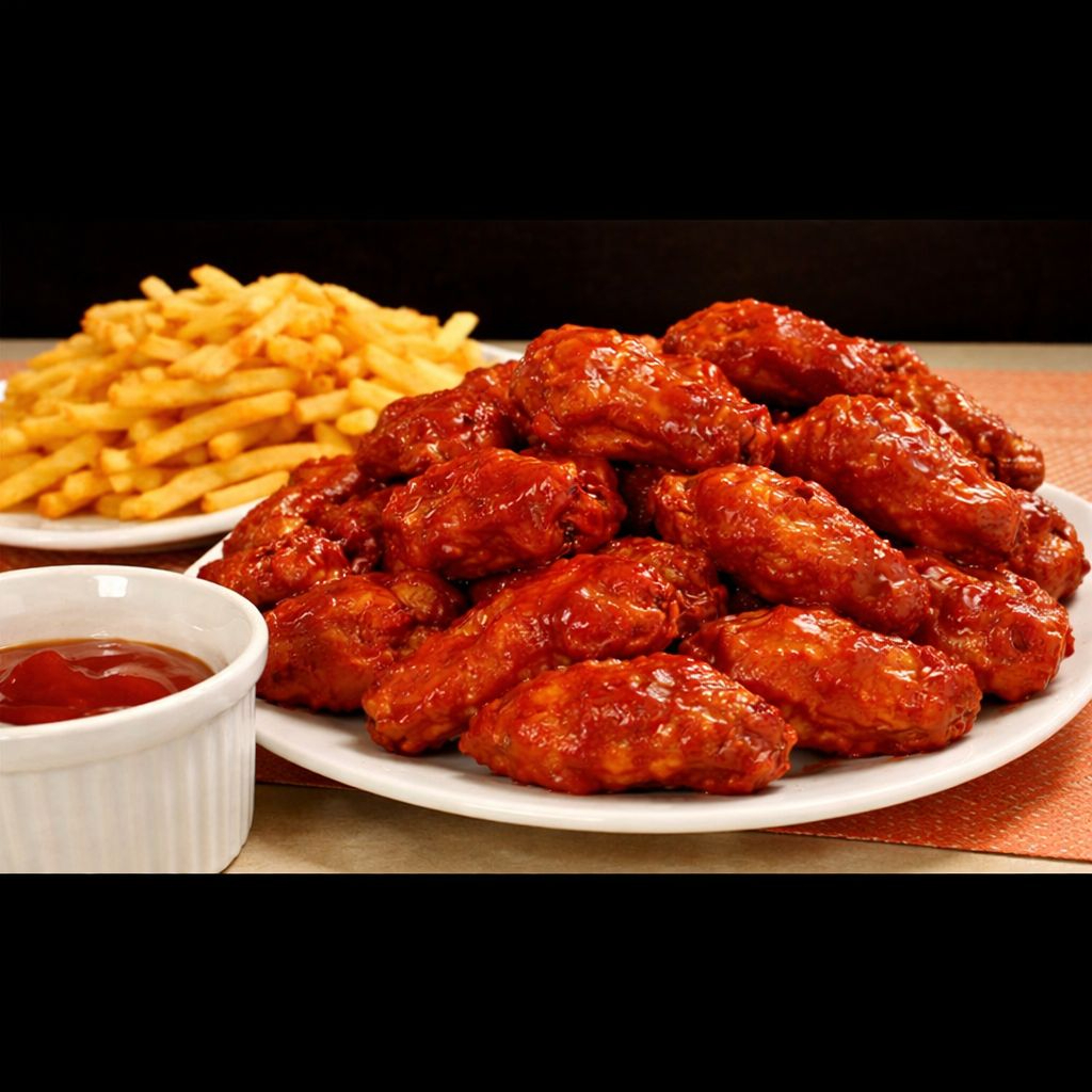 Alitas de buen tamaño & crujientes. Bañadas en 4 sabores de salsas e incluye 3 ranch de 2 onzas. Nota: el peso es en crudo.