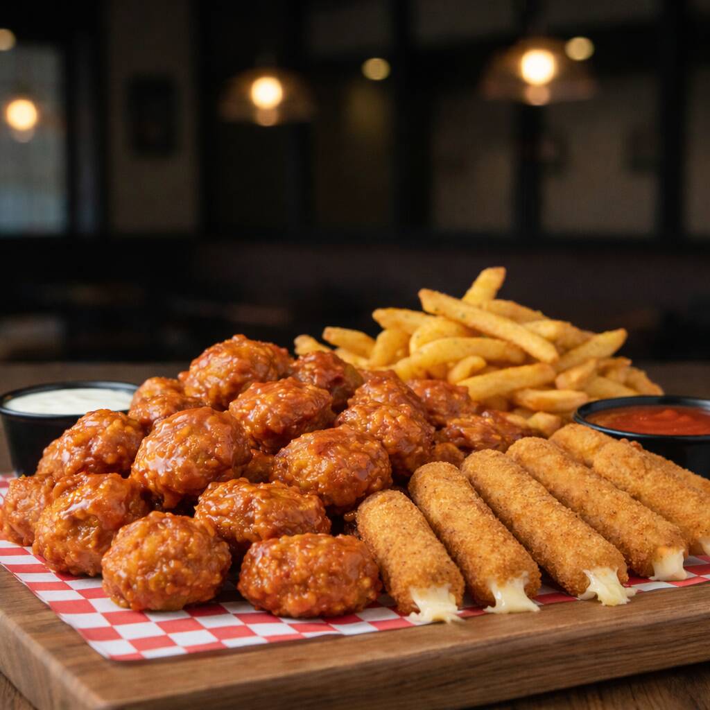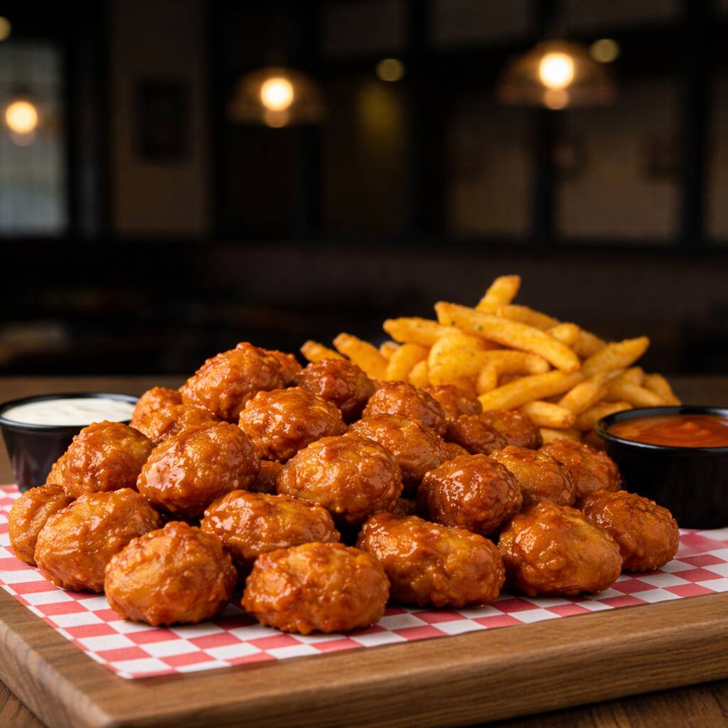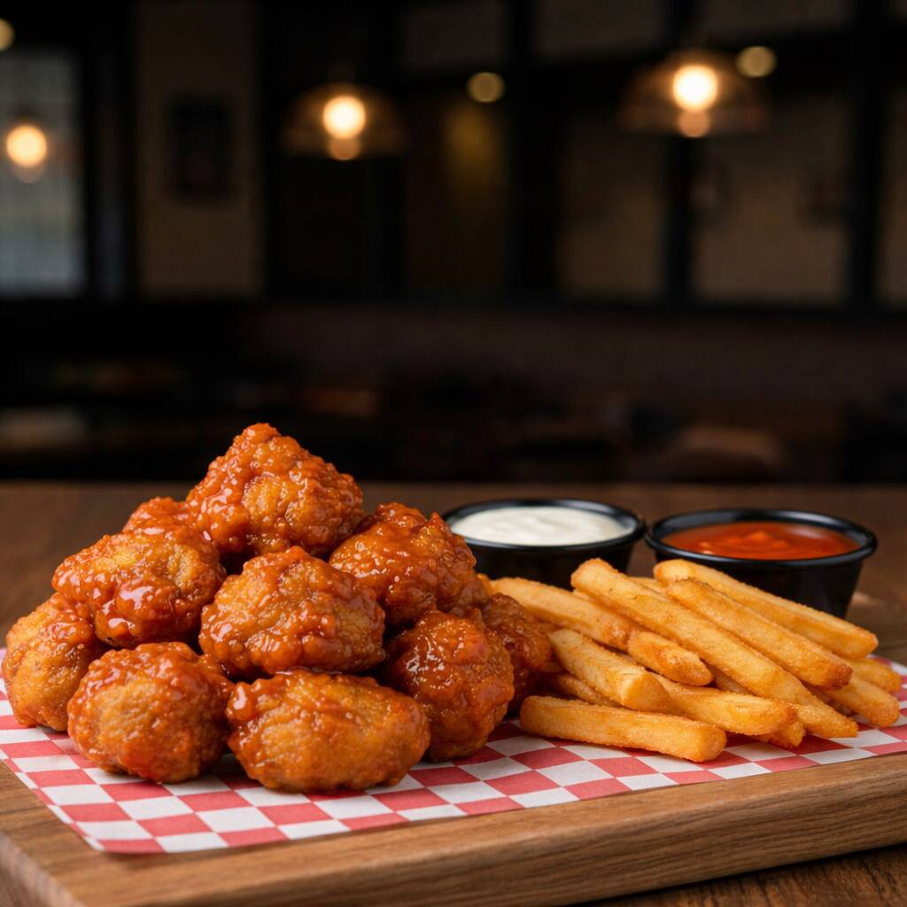 Combo mini ideal para compartir entre dos personas. Incluye 2 porciones de 250 g de boneless + 1 dúo de papas clásicas (equivalente a 2 porciones grandes) y 1 orden de 9 pzas de dedos de queso.