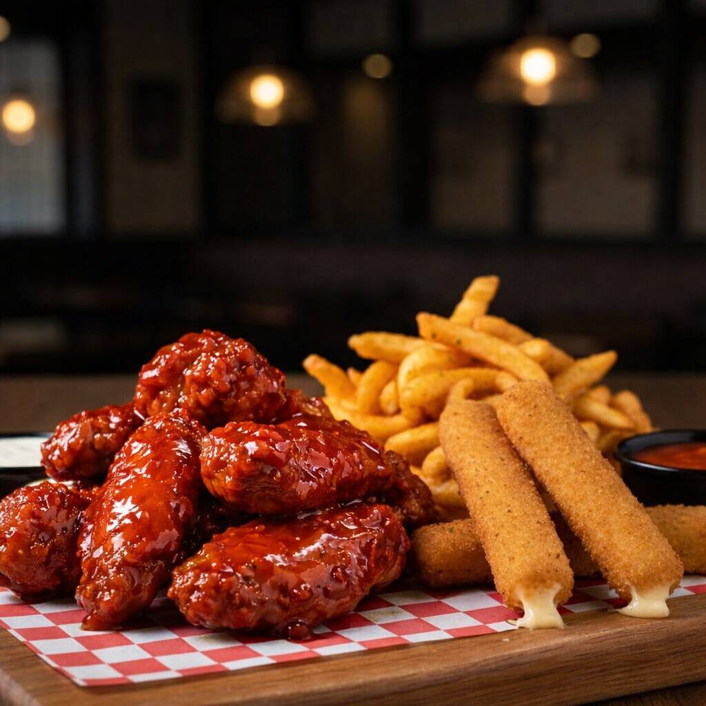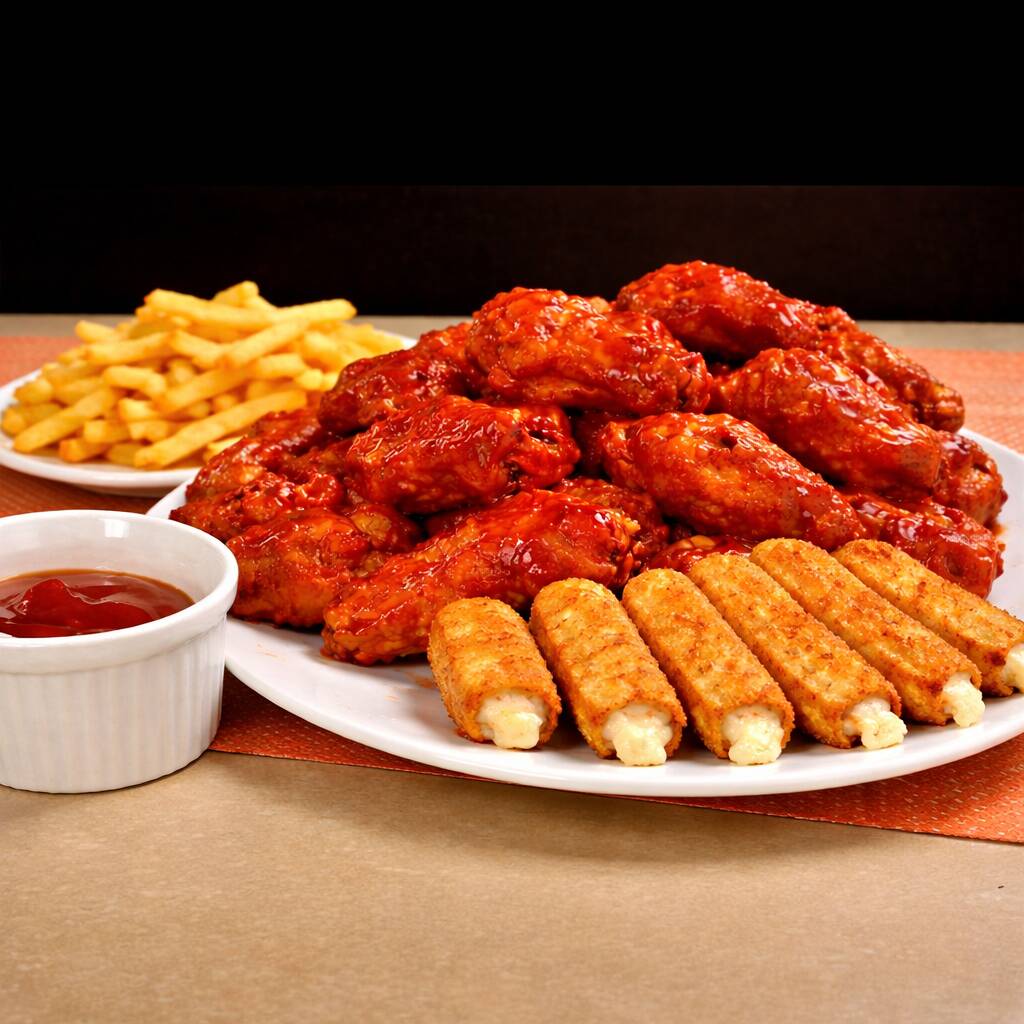 Combo mini ideal para compartir entre dos personas. Incluye 2 porciones de 375 g de alitas + 1 dúo de papas clásicas (equivalente a 2 porciones grandes) y 1 orden de 9 pzas de dedos de queso.