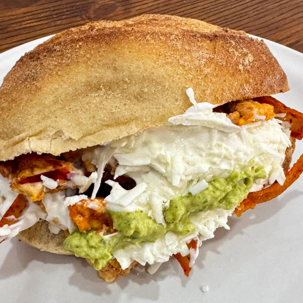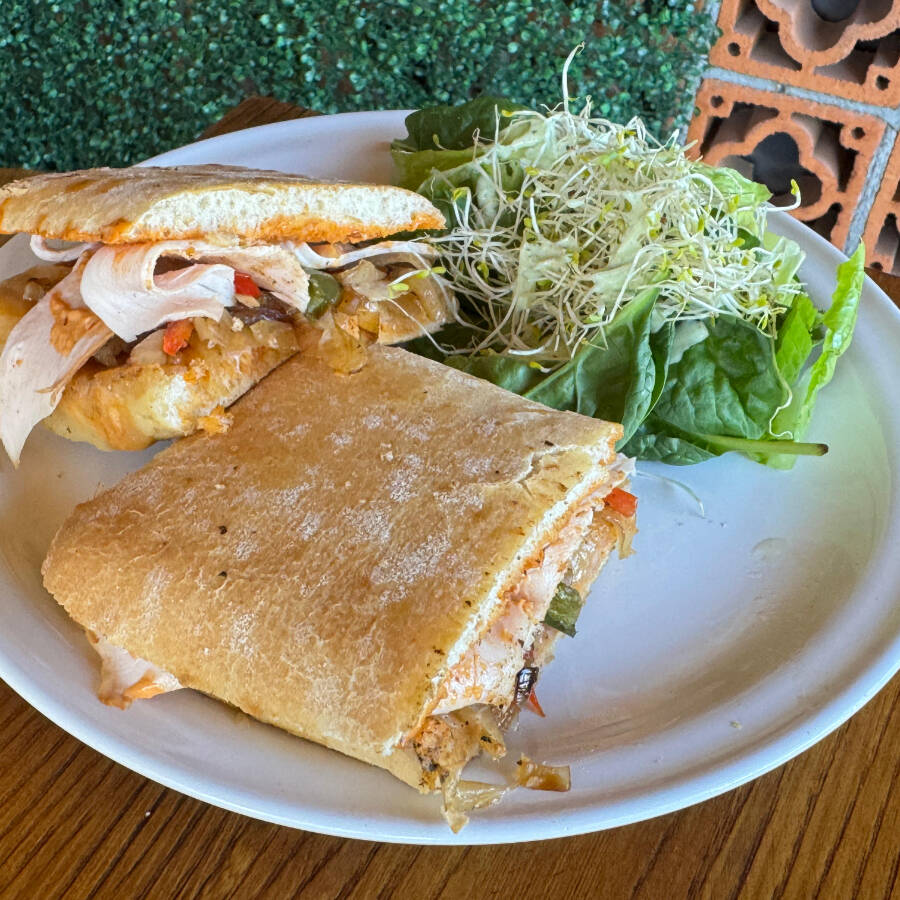 Con pechuga de pavo ahumada, queso gratinado, pimiento ,aguacate, cebolla caramelizada, aderezo de cilantro y germinado de alfalfa