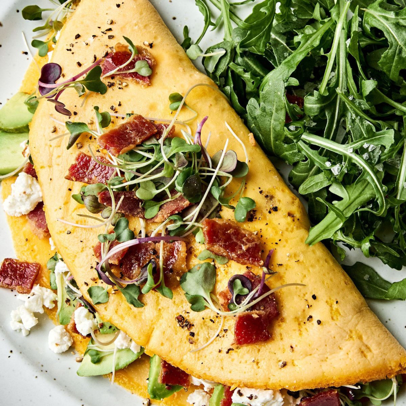 ESPINACAS/CHAMPIÑONES/JAMON Y QUESO/ A LA MEXICANA Suavidad esponjosa de huevo acompañada de notas cremosas de queso y frescura de jardín en una preparación atemporal