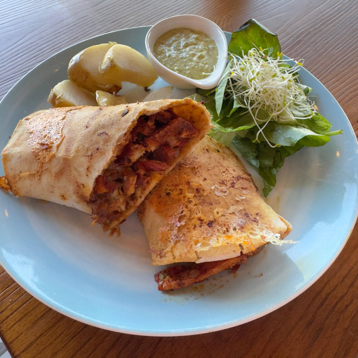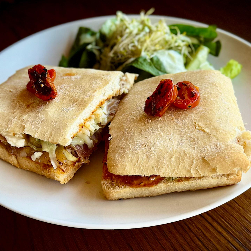 Panini con jamón Serrano queso de cabra, espinaca y germinado de alfalfa