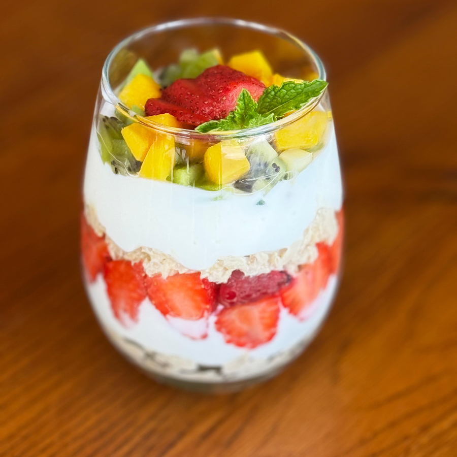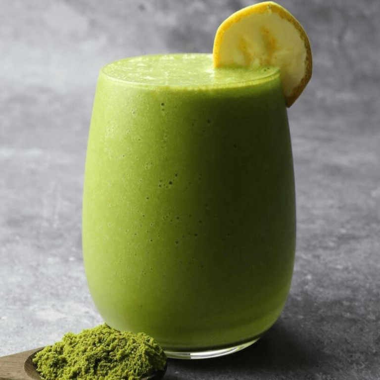 Matcha ,mango,espinaca,scoop de proteína vegetal, granola