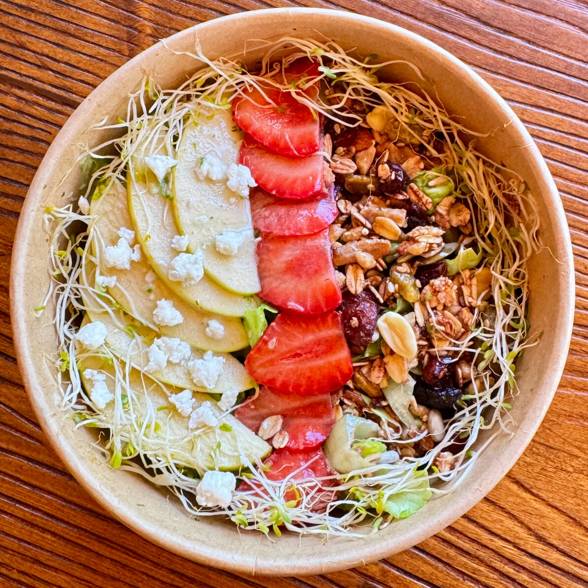 Ensalada de vegetales con fresas , mango y mezcla de granola gourmet, queso de cabra bañada con yogurth Shulun