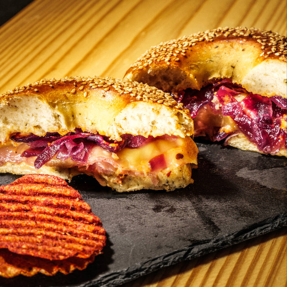JAMÓN SERRANO, QUESO CREMA CON UN TOQUE DE OLIVA Y ADEREZO DE MAYONESA CHIPOTLE Y CEBOLLA CARAMELIZADA