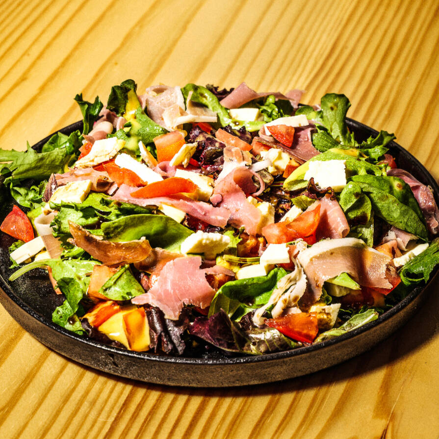 LECHUGA ROMANA, TIRAS DE JAMÓN SERRANO, QUESO PANELA CON VINAGRETA BALSÁMICA