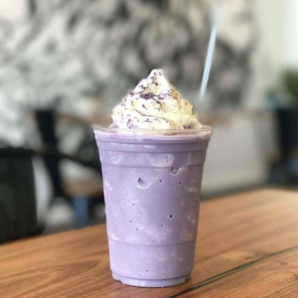 FRAPE DE TARO LECHE ENTERA O DESLACTOSADA TOPPING DE CREMA CHANTILLY Y GRANILLO DE COLORES
