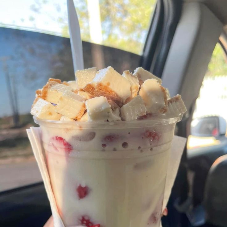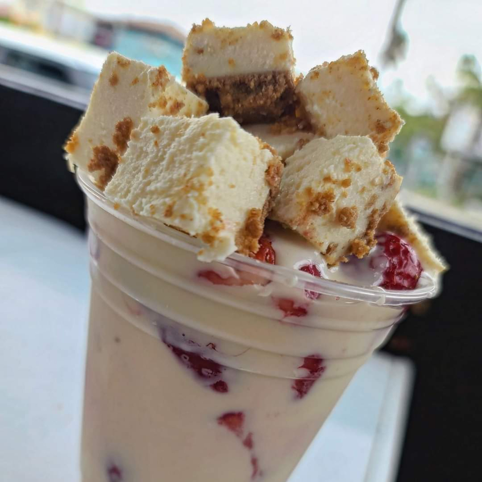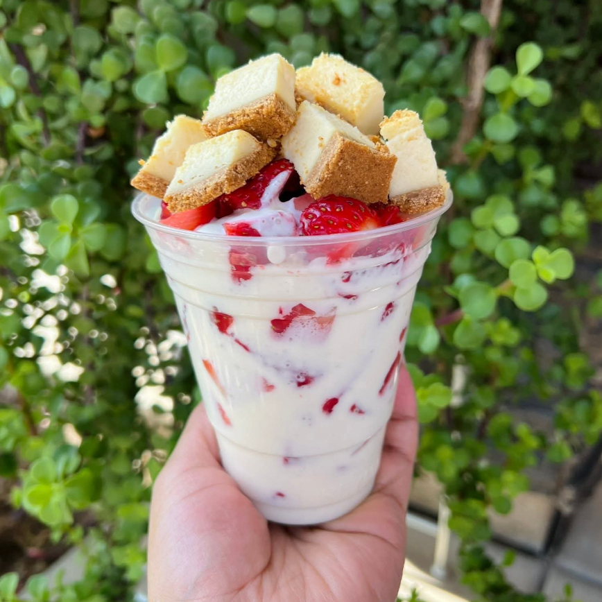 Fresas naturales, crema preparada de la casa, trozos de chesecake, toppings a elegire