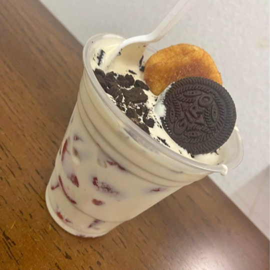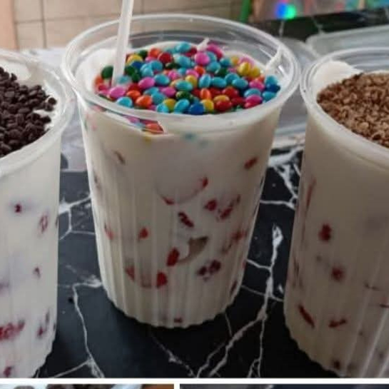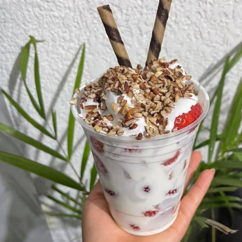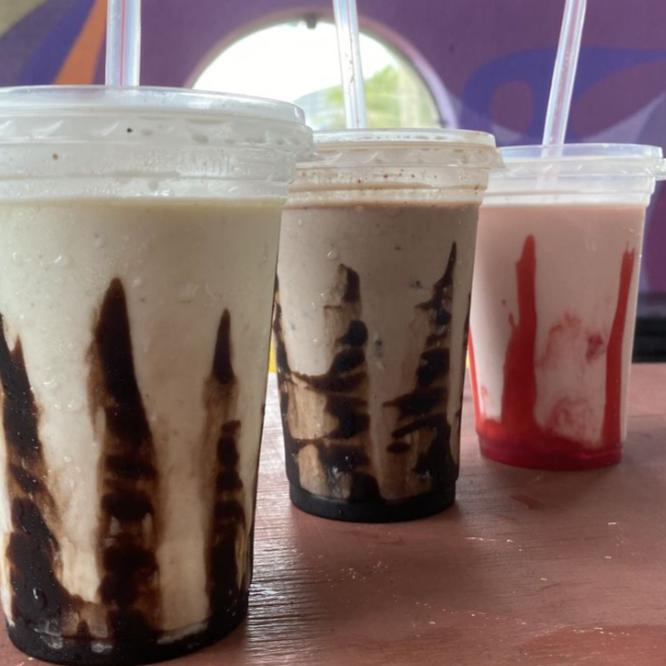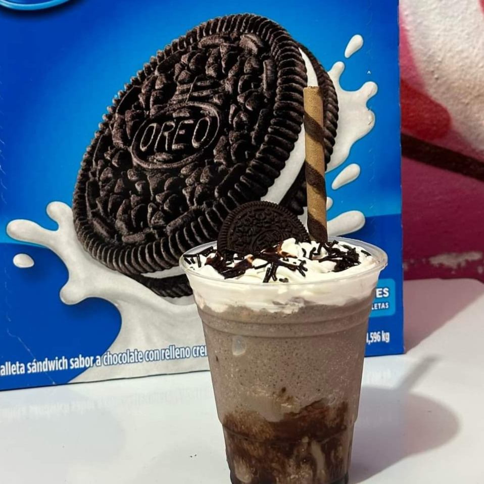 Elaborado a base de hielo, leche, sabor a elegir, crema batida