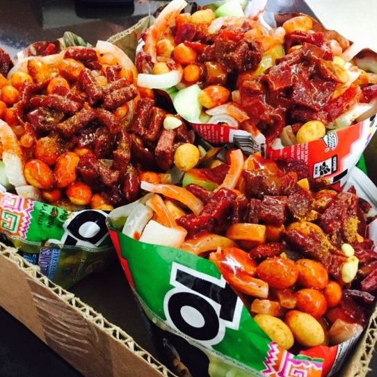 Incluyen Fruta picada como Jicama, Pepino, Cacahuate Japones , Cueritos, Chamoy, Miguelito, Limon, Salsa valentina Dulce de tamarindo