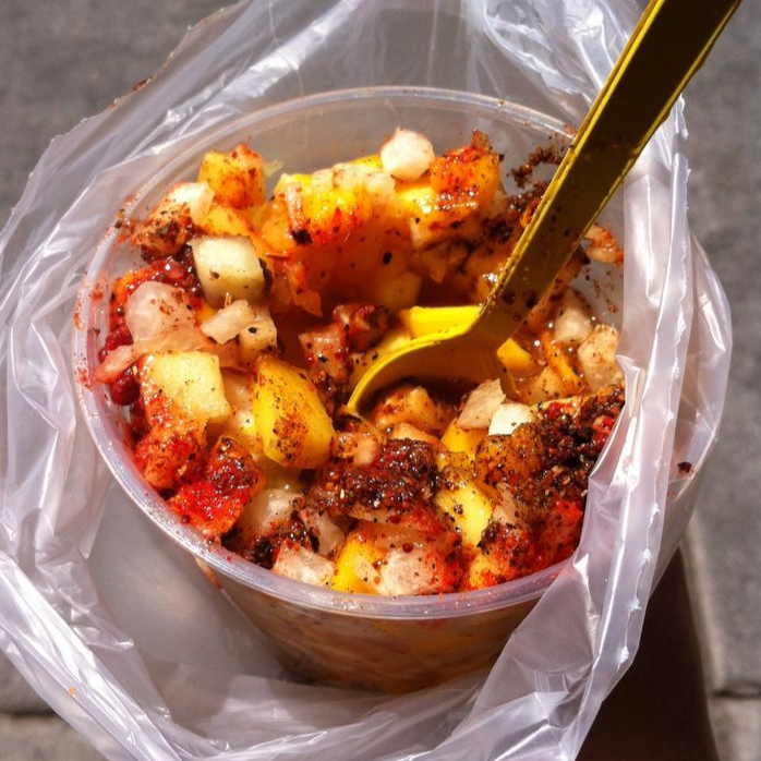 Incluye fruta picada como Sandia, Piña, Melon, Jicama, Pepino, Jugo de naranja, Chamoy,Miguelito, Dulce de rielito