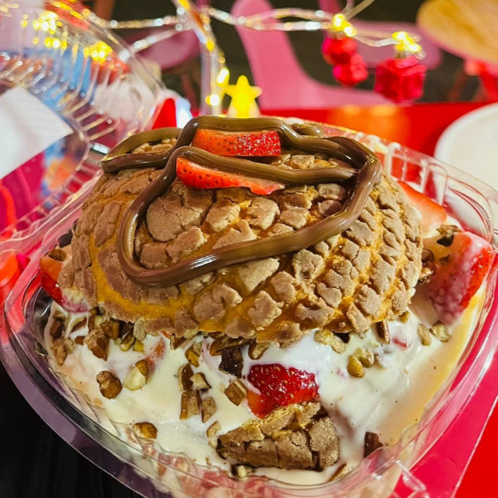 Concha Rellena de Fresas, Crema Preparada de la Casa Y Toppings