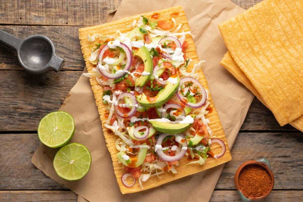 Repollo, cueritos, salsa casera, crema, valentina y limón.