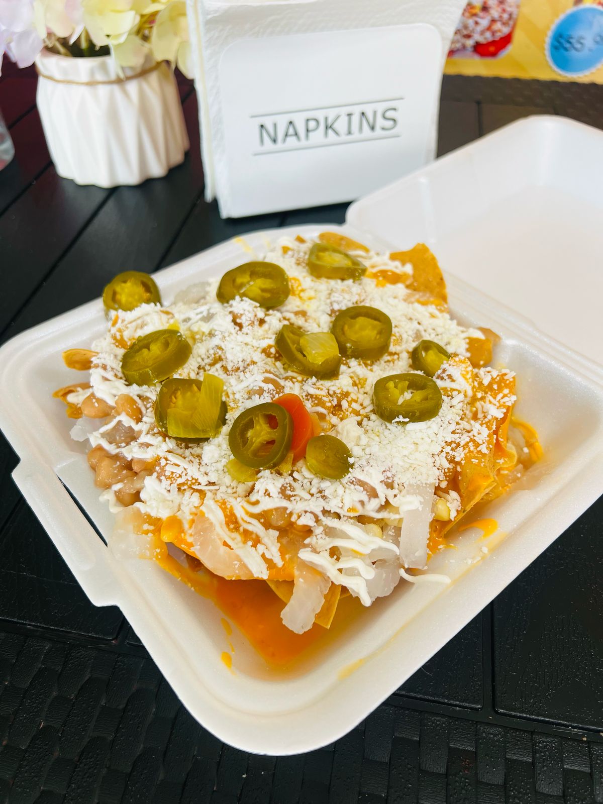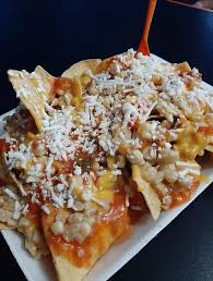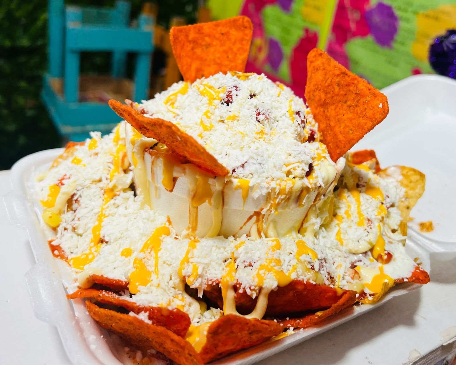 Totopos bañados en queso amarillo, frijoles, cueritos, elotes, crema, queso blanco y chiles en vinagre.