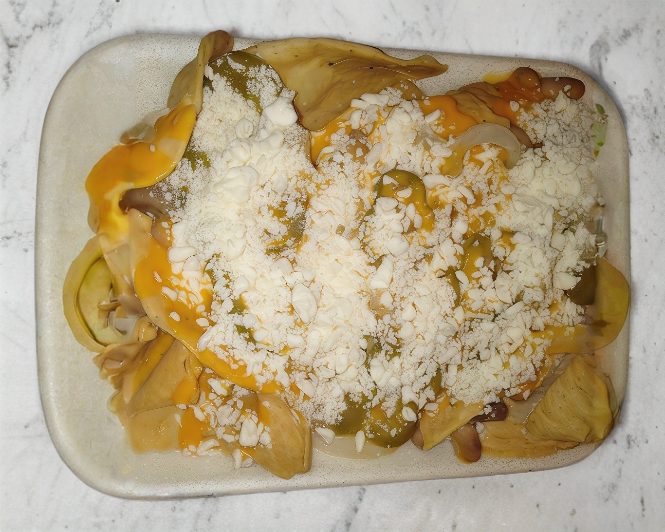 TOTOPO, FRIJOLES, QUESO AMARILLO, CUERITOS, QUESO BLANCO Y CHILE ENVINAGRE