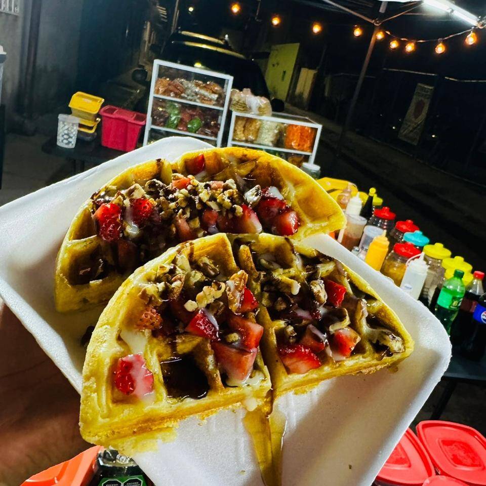 WAFFLES CON PLATANO Y FRESA, 2 TOPPINGS DE TU ELECCION (NUEZ, CHISPAS DE CHOCOLATE, CHOCOLATE HERSEY, LECHERA, MIEL)