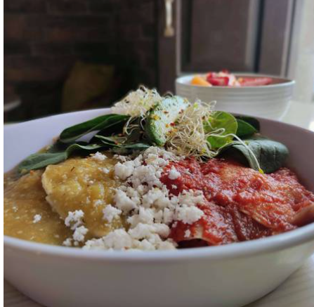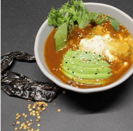 Chile pasilla tostado y molido con hierbas finas, acompañada de un puño de espinacas, pollo deshebrado y tortilla deshidratada con un toque de crema y queso panela.