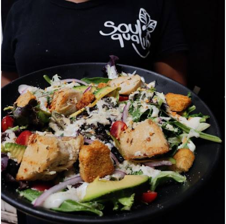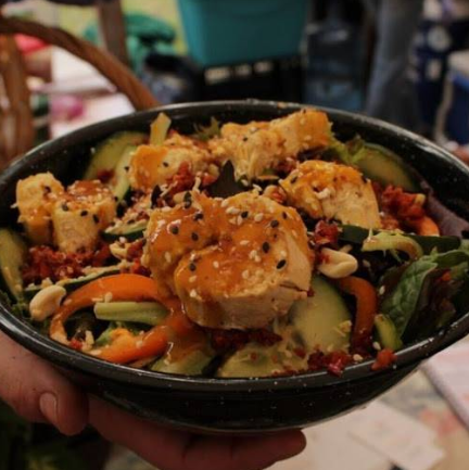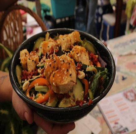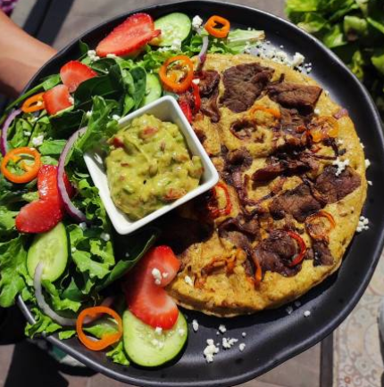 Dos tortillas de harina integral, con su base más la proteína de tu elección, acompañado de una ensalada agridulce y un aderezo sorpresa.