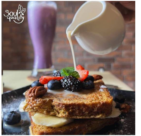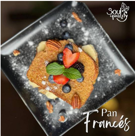 Capas de pan integral, bañadas en huevo y leche de almendras con una porción de frutos secos y cacao liquido, calorías: 495 kclal carbohidratos: 78 g proteína: 25 g.