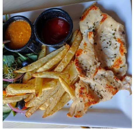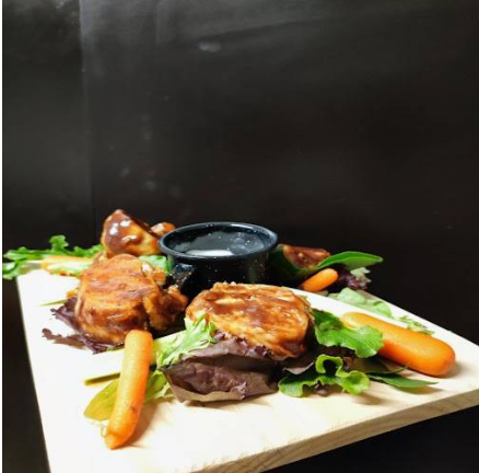 4 Piezas fritas en aire, bañadas en salsa a tu elección, mango, tamarindo, BBQ, naturales, estilo soul sentados en una cama de espinacas con su porción de verduras y aderezos. Calorías: 196 kcal carboh: 29 g, prot: aprox. 34 g.