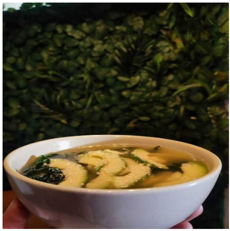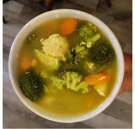 Preparada como caldo, zanahoria, calabacita, brócoli, pimiento y papa con trozos de queso panela y un toque de chile chipotle. Calorías: 135 kcal carboh: 35 g prot: 6.9 g.
