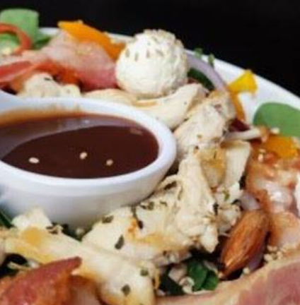 Trozos de tocino frito, con pollo deshebrado bañados con un aderezo agridulce, esparcidos en una base de lechuga, con pepino, pimiento, cebolla morada, pepitas y ajonjolí negro. Calorías: 292 kcal carboh: 9.95 g prot: 48.19 g.