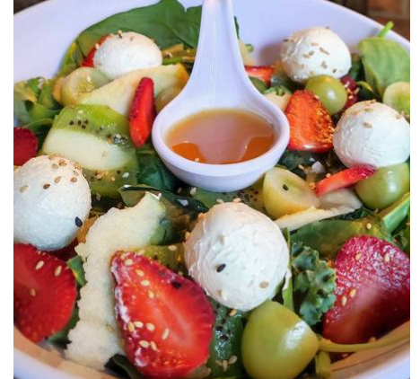 Ensalada de frutas mixtas kiwi, fresa, uva, manzana, montadas en su base de lechuga, espinacas y pepino rallado con bolas de queso crema. Calorías: 345 kcal carboh: 26 g prot: 23.2 g.