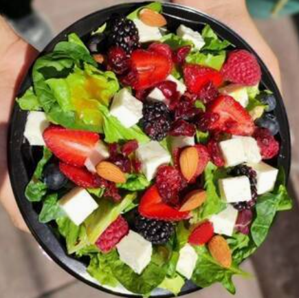 Mezcla de hojas verdes, bañadas en miel de abeja, con una porción de frutos rojos y arándanos secos, como proteína cubos de queso panela y aderezo sorpresa.