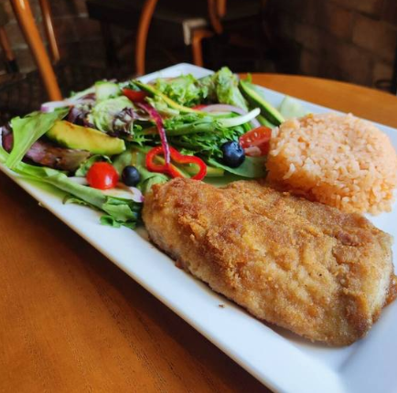 Res, pollo o pescado Empanizado con galletas habaneras, como guarnición, 1⁄2 taza de arroz integral, con una ensalada de lechuga italiana con aceite de oliva, trozos de aguacate, cherrys y pimientos. Calorías: 456 kcal Carboh: 67 g Prot: aprox. 28 g.