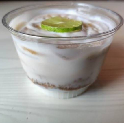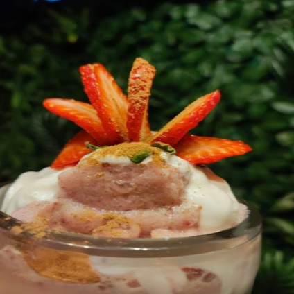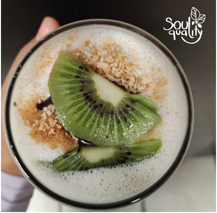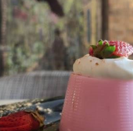 Fresa, rompope y fruta en leche de almendras con yogurt griego.