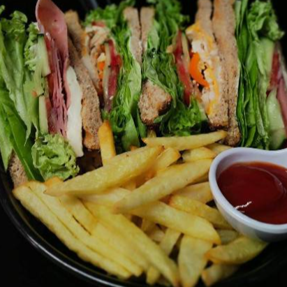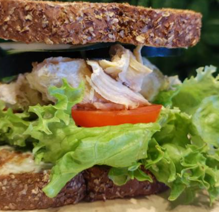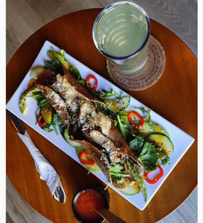 Capas de pan integral muy ligero, con su base y proteína de tu elección acompañado de una ensalada agridulce.