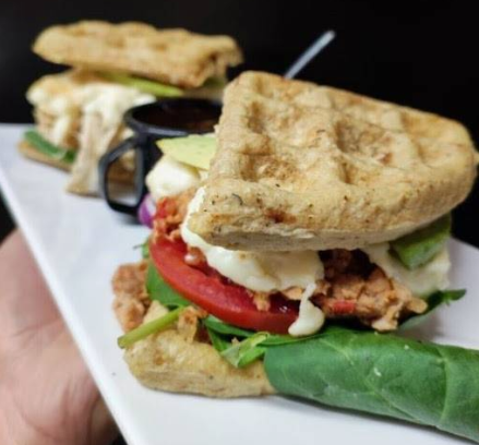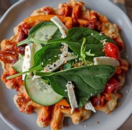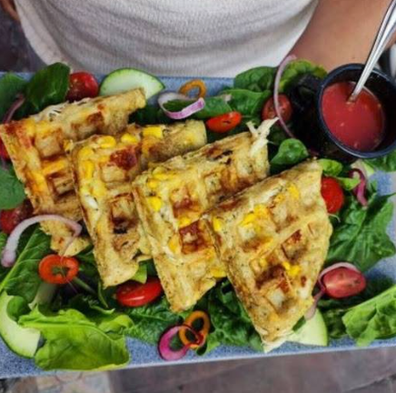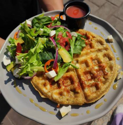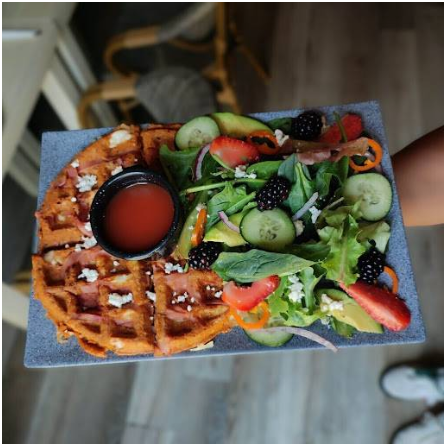 Waffle carne de res estilo fajitas, montado sobre un waffle a las finas hierbas, acompañado con una ensalada y una salsa tatemada. Calorías: 271.2 kcal carboh: 40.67 g prot: 33.8 g.