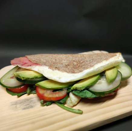 Tajadas de jamón con queso panela envuelto sobre el omellette. Calorías: 430 kcal carboh: 10.98 g prot: 27.43 g. Plato montado con una ensalada agridulce como base lechuga, pimiento, pepino, cherry, acompañado con una porción de frijoles con queso y totopos de la casa.